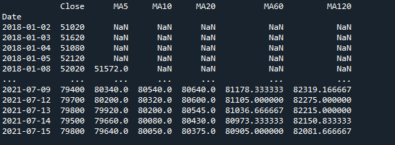 위 코드를 이용하여 이용하여 이동평균선을 계산하였다.